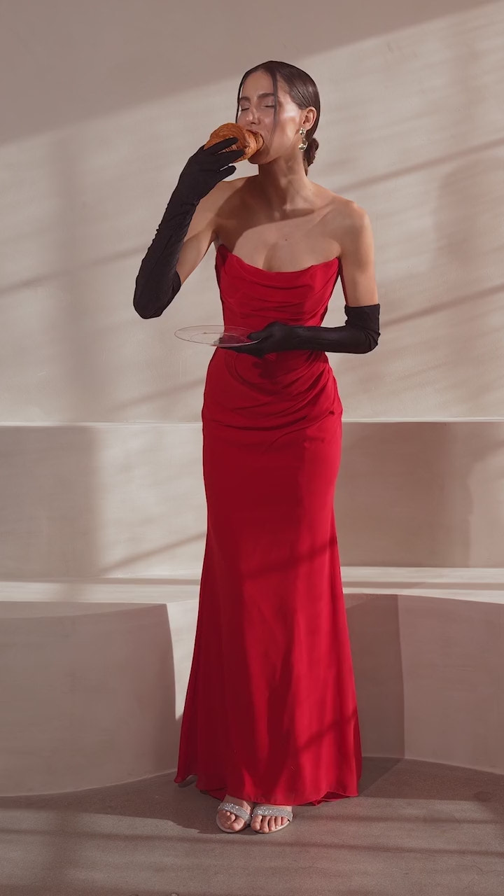 This chiffon strapless gown will make you look unforgettable. It has a fitted silhouette with a scoop neckline and a gathered bodice and hip line for a flattering effect. The flowy chiffon fabric adds a touch of elegance while the fitted bodice ensures a sleek and structured fit. Whether you're attending a wedding, serving as a bridesmaid, or attending a formal event, this dress exudes sophistication and effortless charm.
