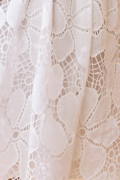 Graceful and romantic, this white floral lace mini dress is the perfect blend of structure and softness. Designed with a strapless bodice and a flattering center V neckline, this silhouette accentuates the waist before flaring into a voluminous skirt that moves with elegance. The intricate woven lace adds timeless charm, making it a standout choice for bridal events, graduations, and summer celebrations.