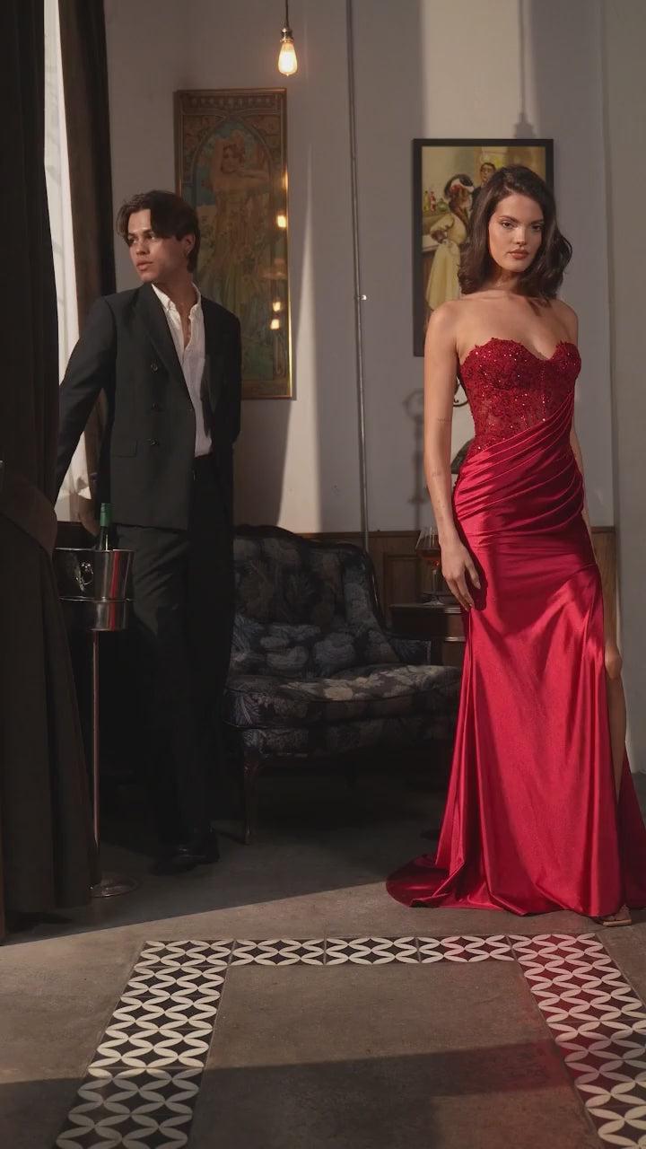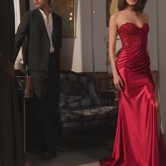 Radiate elegance in this strapless fitted gown, a timeless choice for formal occasions. The sweetheart neckline is adorned with intricate lace detailing, beautifully complemented by a pleated satin bust that exudes sophistication. The structured bodice, complete with a corset back closure, ensures a flattering and supportive fit, highlighting your silhouette with grace. Ideal for prom, black-tie events, or any formal gathering, this gown blends classic charm with refined style, making it a stunning statement piece for your wardrobe.