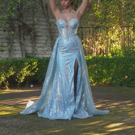 This fitted strapless dress features a plunging neckline and a structured bodice for excellent support, complemented by a lace-up corset back for a custom fit. The removable overskirt adds dramatic flair, while the glitter-printed layered tulle and crystal beading create a captivating, shimmering effect. Ideal for prom, black tie events, or red-carpet premieres, this gown offers both sophistication and glamour in one stunning design.