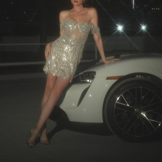 Turn heads with this chic fitted short dress, designed to dazzle at any event. The off-the-shoulder neckline is adorned with playful fringe detailing, while the sheer, intricately beaded bodice adds a touch of bold elegance. Crafted from shimmering sequins and tulle, this dress combines glamour with a structured fit for ultimate comfort and confidence.