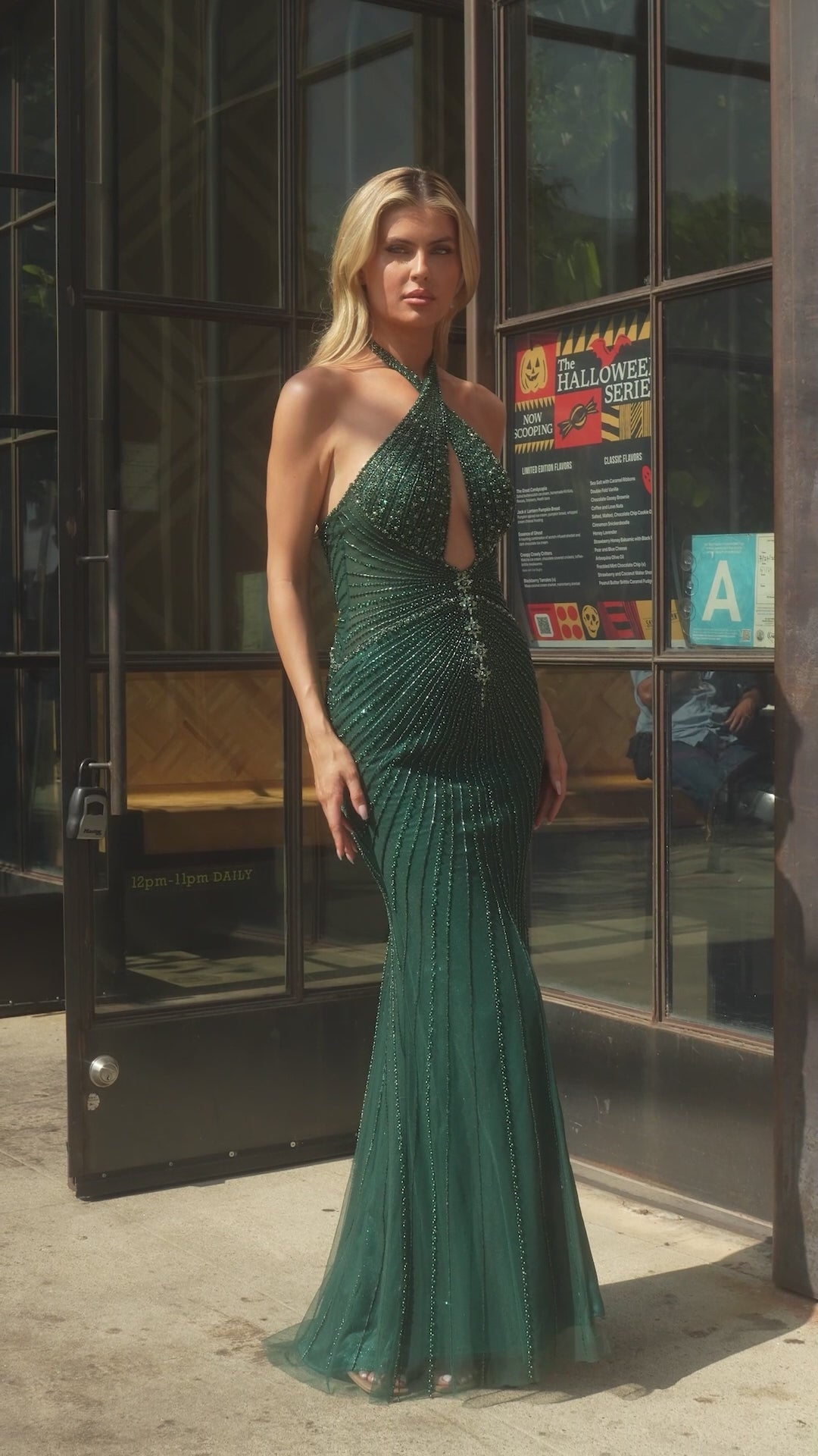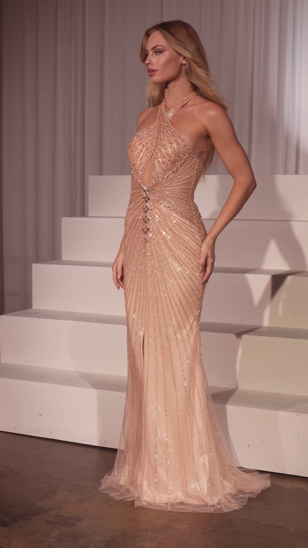 Radiating elegance, this fitted gown showcases a halter keyhole neckline and is fully adorned with shimmering sequins and beads for a dazzling effect. The structured bodice ensures a flawless fit, while the leg slit adds a modern touch of allure. Perfect for prom, black-tie galas, and formal occasions, this dress brings a captivating blend of sophistication and style.