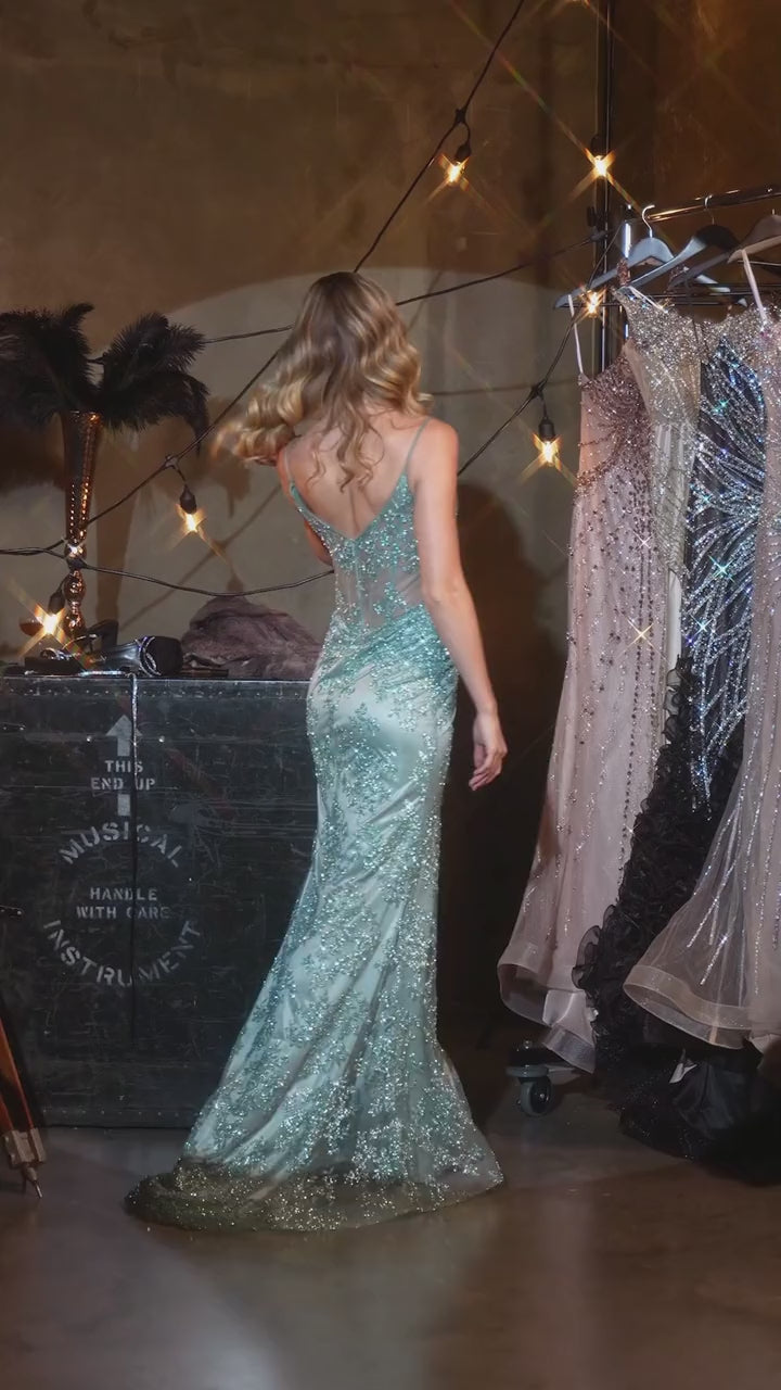 Command attention in the Jadyn Gown, a stunning fitted silhouette featuring a sheer corset bodice adorned with intricate beading and hand-placed appliqué. Delicate spaghetti straps frame a flattering sweetheart neckline, while shimmering sequins trace the tulle overlay to highlight every curve. Finished with a subtle train for added drama, this gown blends allure and sophistication, making it perfect for prom, galas, red-carpet events, and other formal occasions.