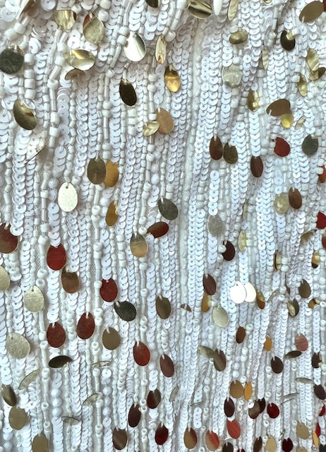 Radiate elegance in the Jovani 43623 Gown, a dazzling white and gold sequin gown featuring a plunging neckline, high slit, and low open back for a show-stopping finish. The fitted silhouette hugs your curves beautifully, making it the perfect choice for prom, pageants, or any formal event.