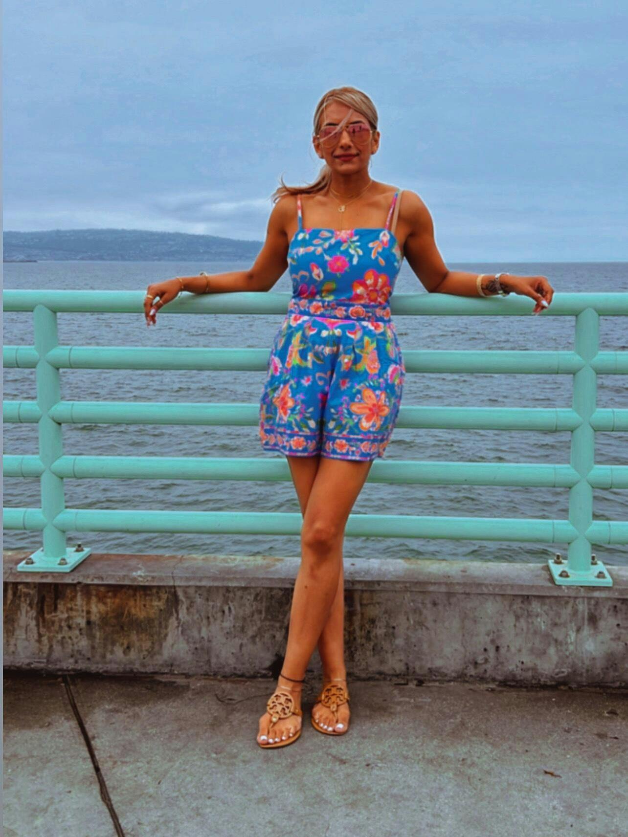Perfect for beach strolls, brunches, or spontaneous getaways, this blue floral romper features a fitted bodice and a back zipper closure for easy wear. Its cheerful floral pattern adds a playful touch to any sunny-day outing.