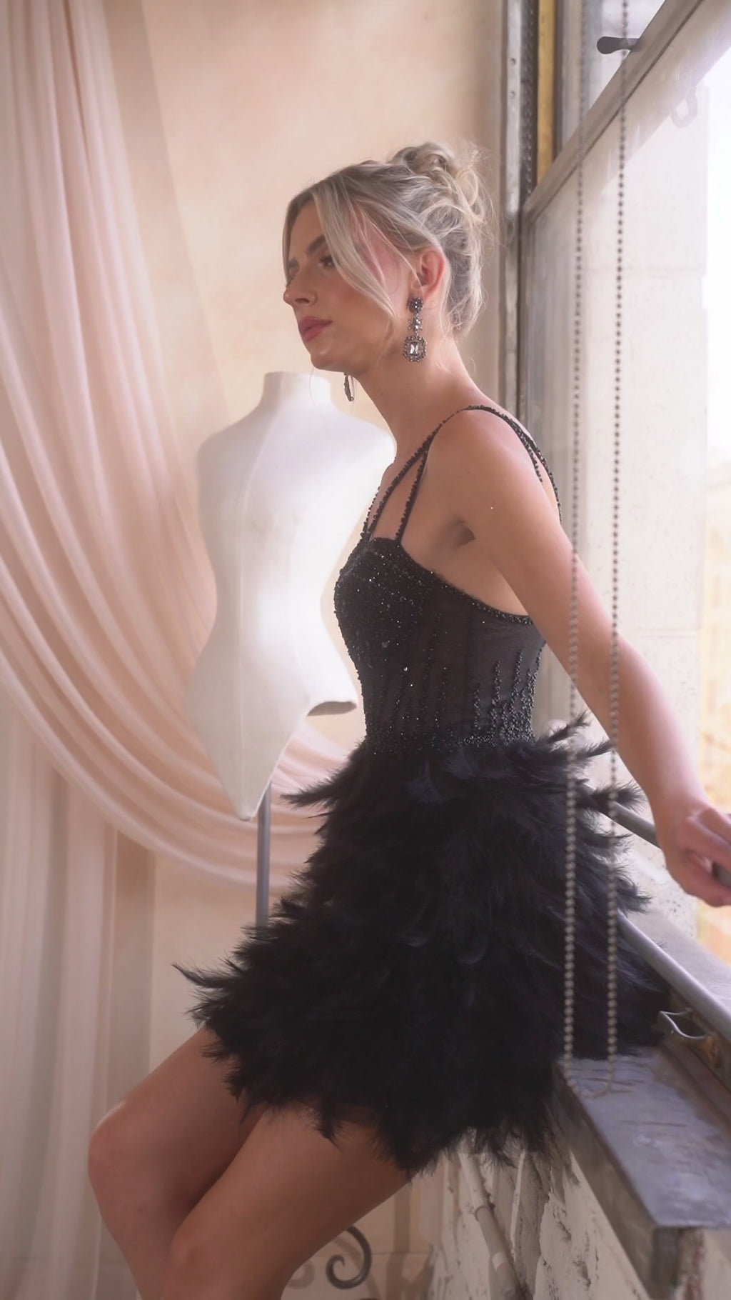 Turn heads in this stunning PS23902 mini dress in purple, designed to make a statement at any special occasion. The intricately beaded bodice sparkles with elegance, featuring delicate embellishments that catch the light with every movement. Below, a feather skirt adds a touch of drama and fun, creating a striking contrast with the fitted top. Perfect for cocktail parties, upscale events, or a night out on the town.