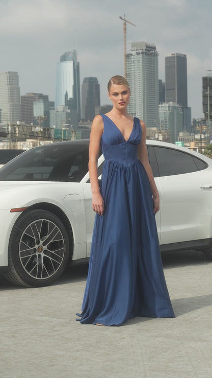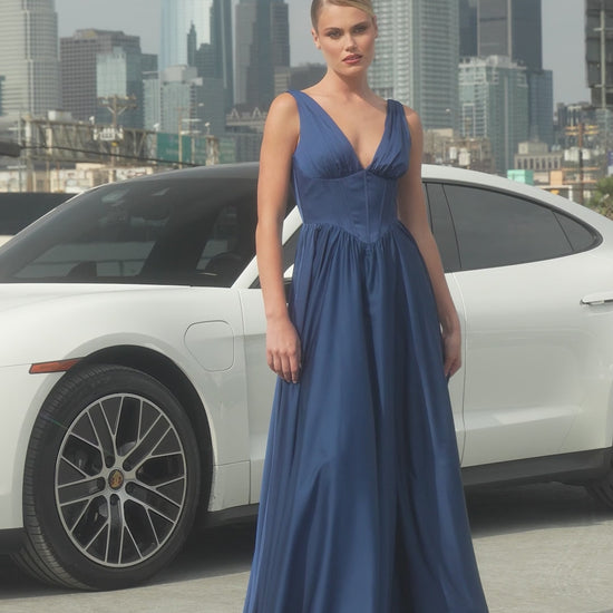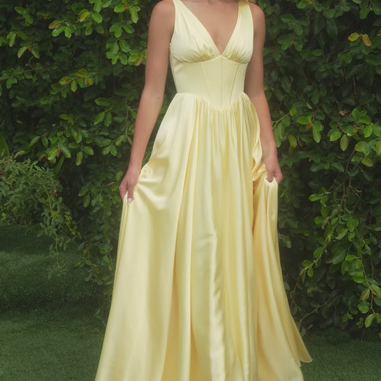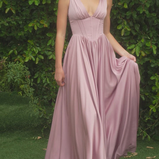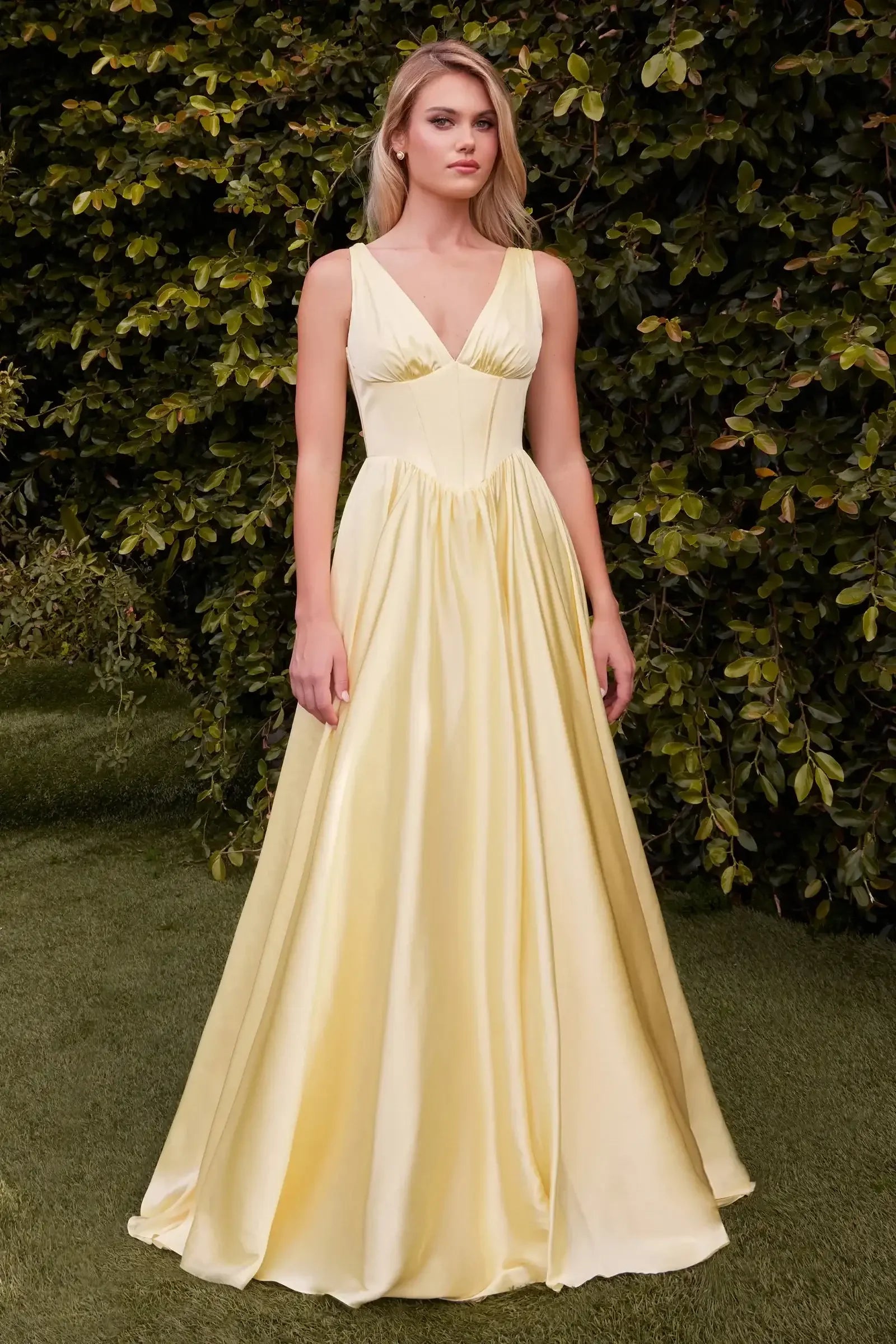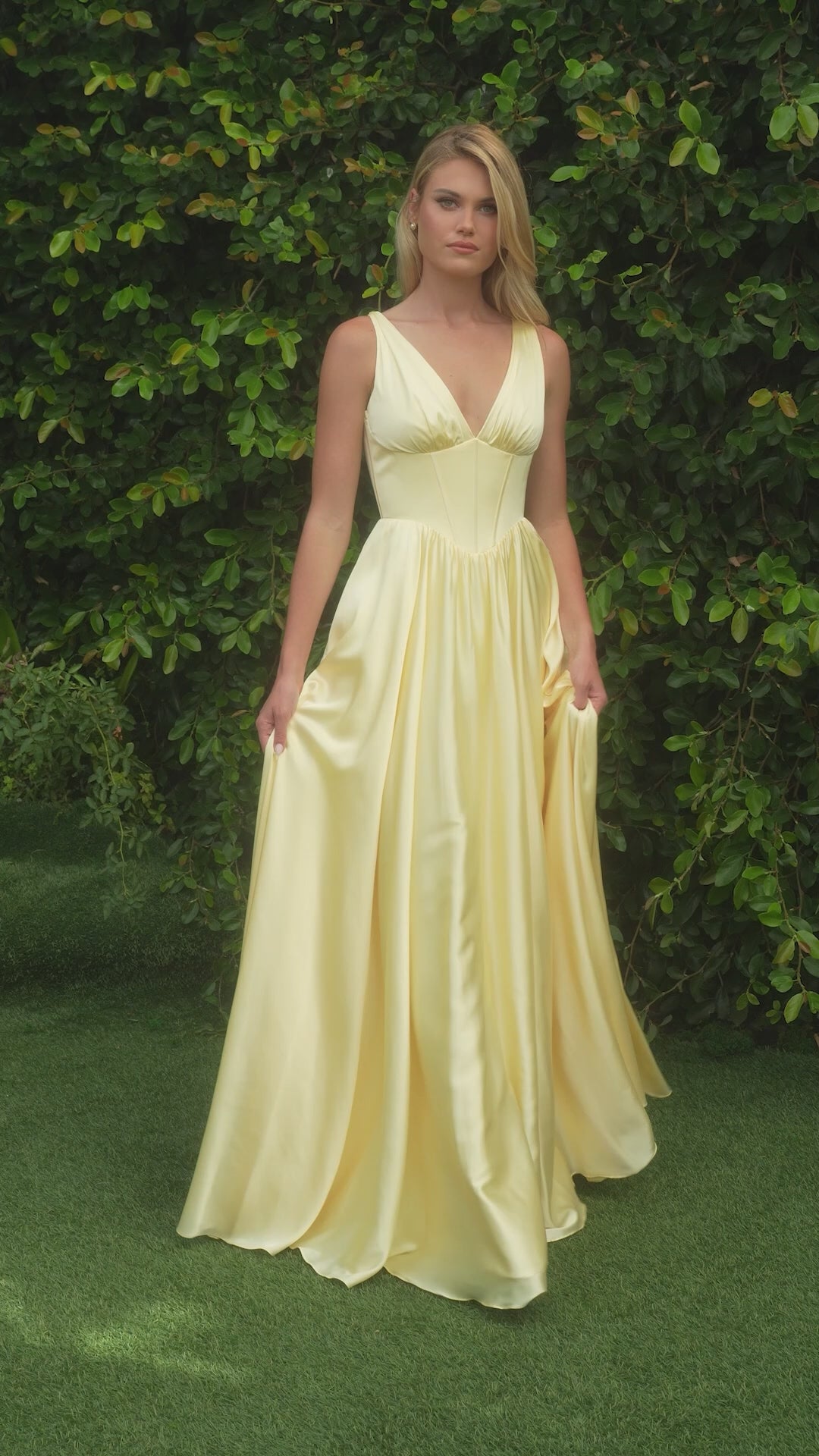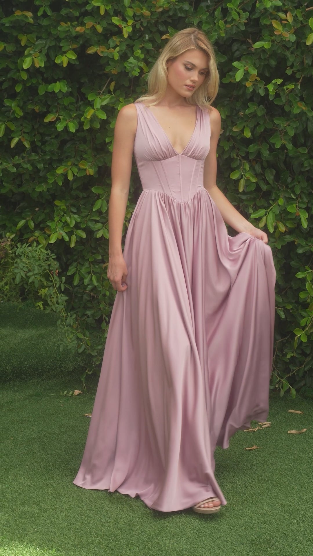 This stunning A-line gown blends timeless elegance with modern sophistication. Featuring a graceful V-neckline and delicate straps, the beautifully pleated bodice adds a touch of refinement. Crafted from soft satin, the structured boned bodice and lace-up corset back provide a secure, flattering fit that enhances your silhouette. Perfect for bridesmaids, wedding guests, formal events, or prom, this dress radiates effortless charm.