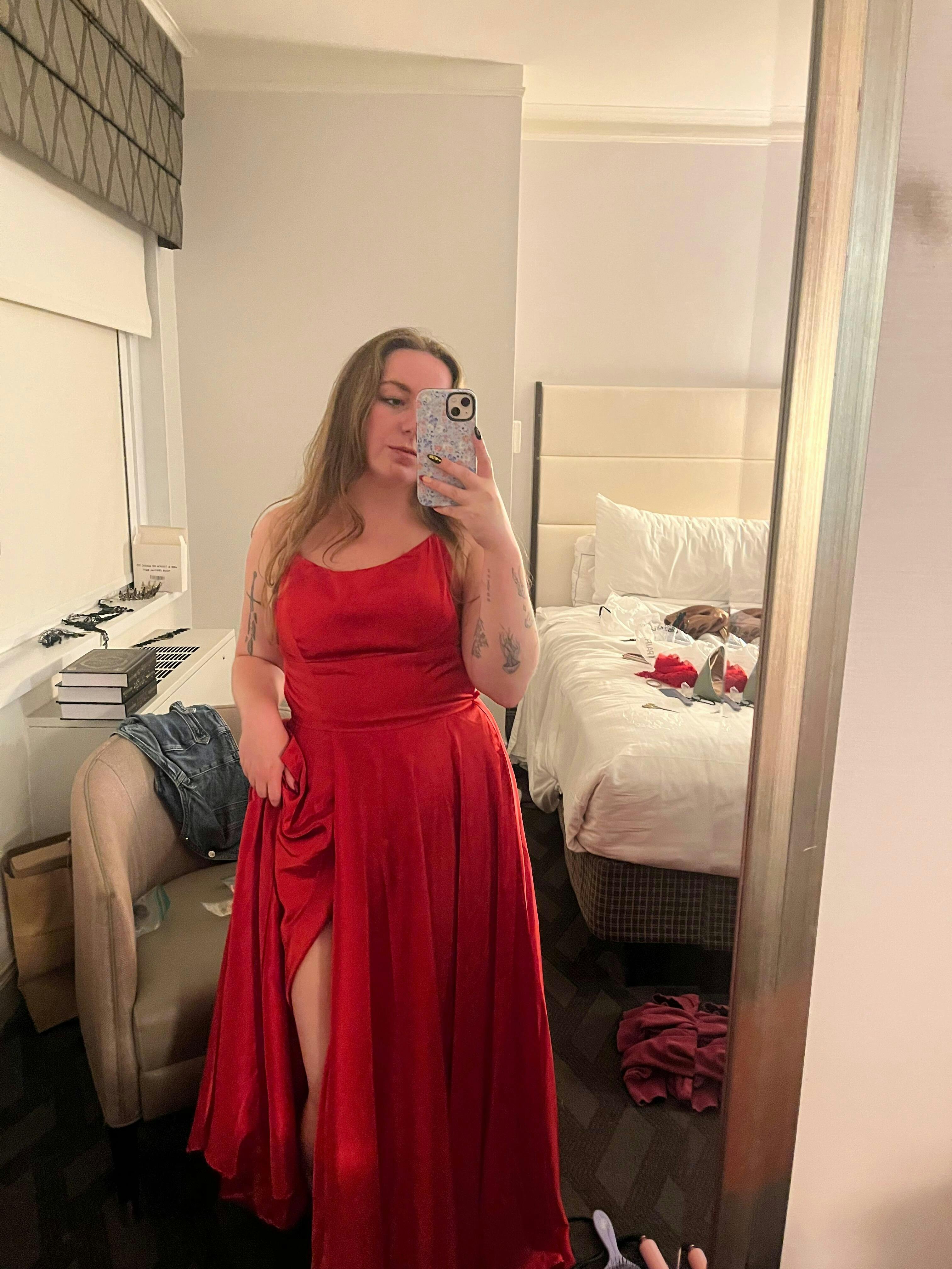This style is an effortless A-line gown with straight across neckline and leg slit!