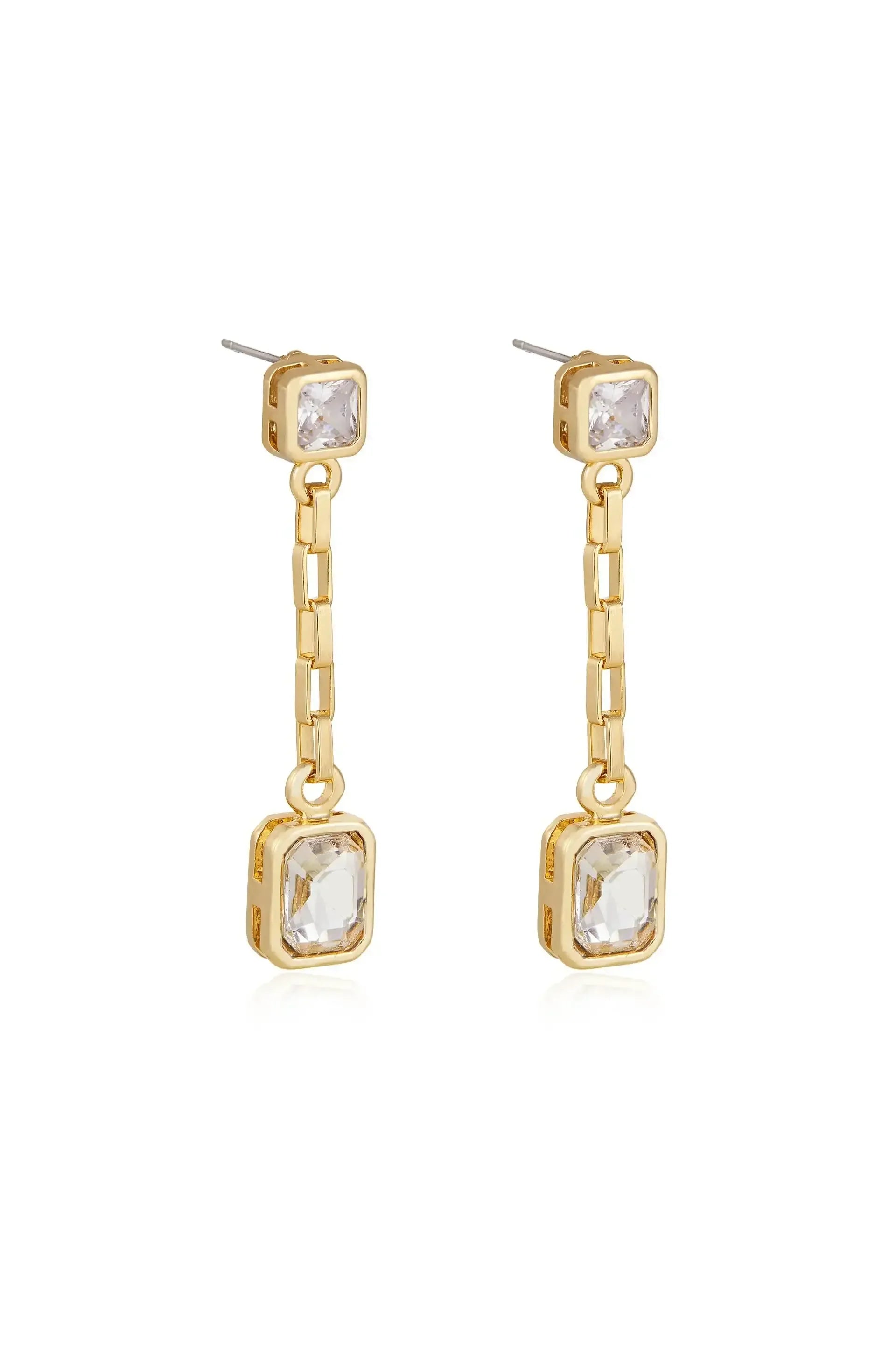 Two gold-tone earrings feature a linear design with a rectangular clear stone at the top and a larger rectangular stone at the bottom, suspended by a delicate chain.