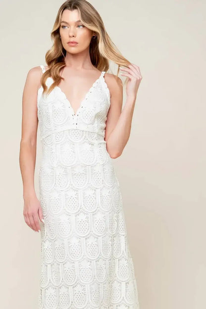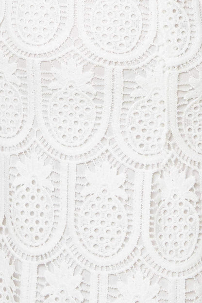 Step into vacation mode with the Pineapple Paradise Lace Dress—a charming white lace mini designed to transport you straight to the tropics. Delicate pineapple embroidery adds a playful twist to the classic lace design, making it the perfect choice for beach getaways, resort dinners, or sunset strolls. With its lightweight feel and breezy silhouette, this dress brings effortless elegance and a hint of whimsy to your warm-weather wardrobe.