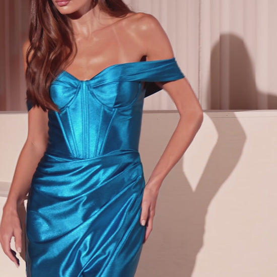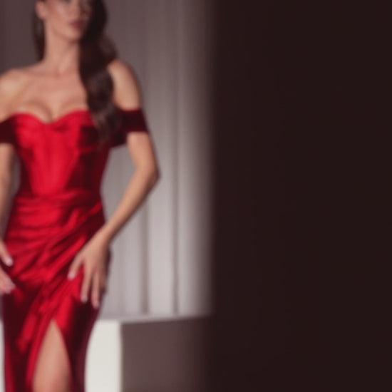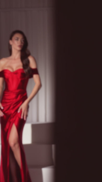 This fitted gown exudes elegance with its off-the-shoulder sweetheart neckline and gathered asymmetrical waistline that perfectly flatters your figure. Made from luxe semi-shimmer satin, the dress offers a structured bodice for excellent support, and a daring leg slit adds an extra touch of allure. Ideal for prom, weddings, or any formal event, this dress promises to make a lasting impression wherever you go.