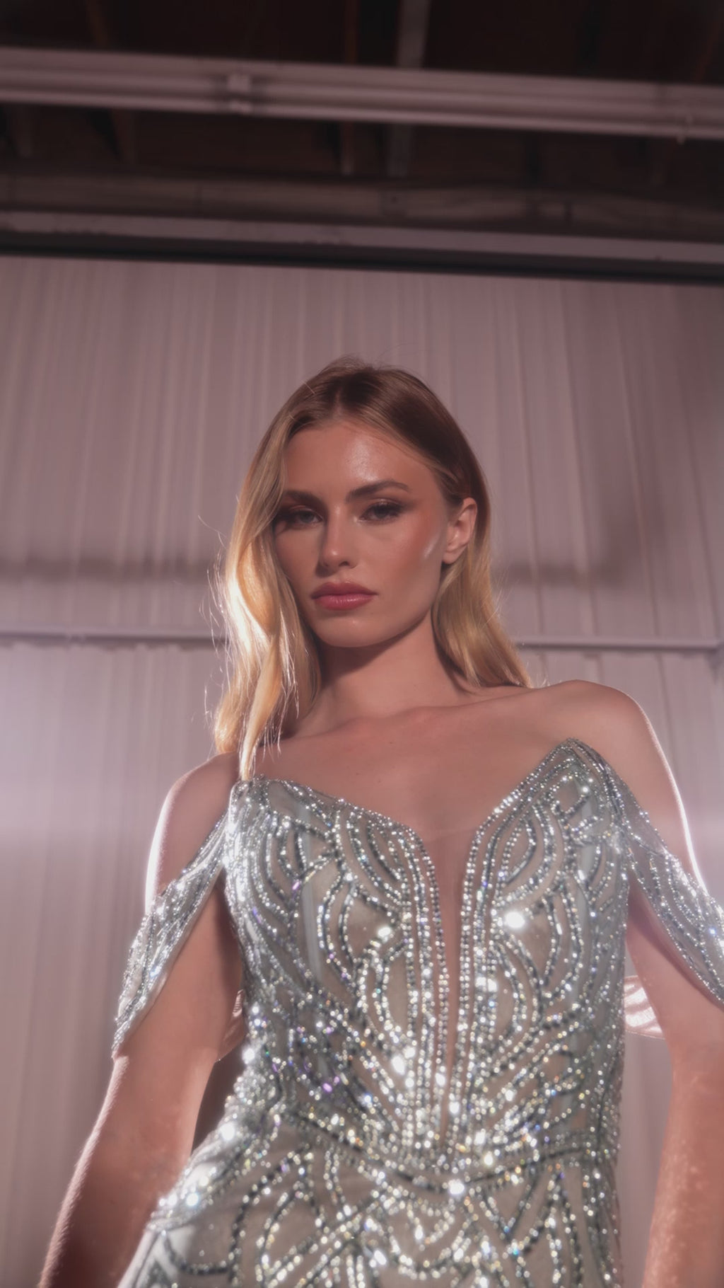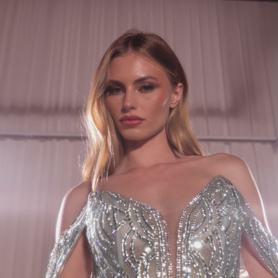 This strapless fitted gown effortlessly blends modern glamour with timeless elegance. Featuring a sweetheart neckline and an intricately art deco-inspired beaded bodice, it sparkles beautifully under the light. The gathered waistline flows into a fit-and-flare mermaid silhouette, crafted from crystal-embellished tulle for a luxurious feel. The lace-up corset back provides a customizable fit, ensuring both comfort and sophistication.