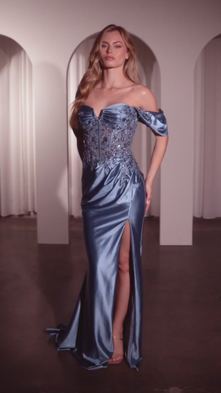 This fitted gown exudes elegance with its sweetheart off-the-shoulder neckline and delicately lace-embellished bodice. Crafted from semi-stretch satin, it offers a flattering fit that enhances natural curves while allowing for graceful movement. Perfect for prom and formal events, this design blends classic romance with modern sophistication.
