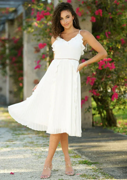 A woman stands in a fitted white dress with off-the-shoulder sleeves and a flared hem. She is in an outdoor setting with stone columns and greenery, showcasing a bright, sunny atmosphere.