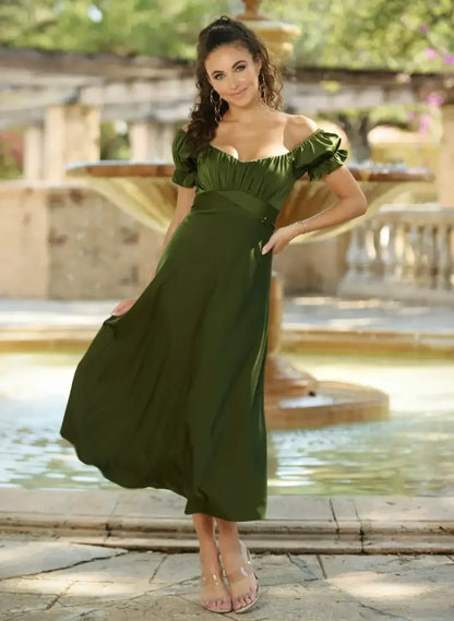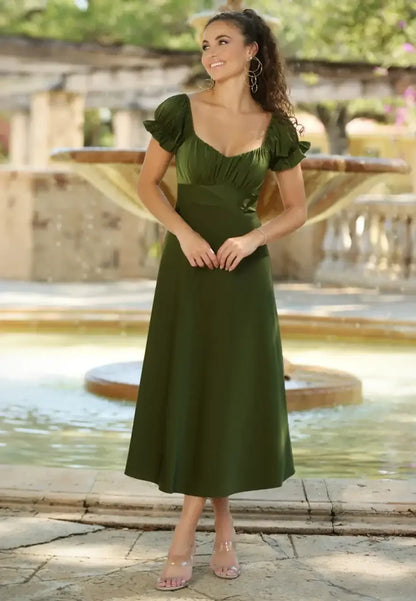 A woman stands smiling in an elegant, fitted olive green dress with puff sleeves. She is posed near a stone fountain surrounded by greenery, emulating a serene outdoor atmosphere.