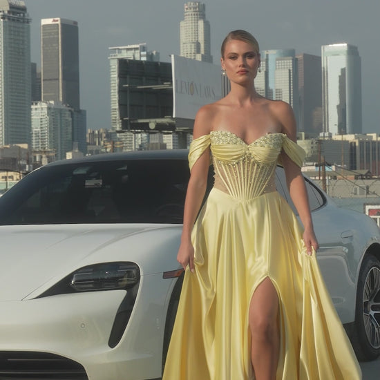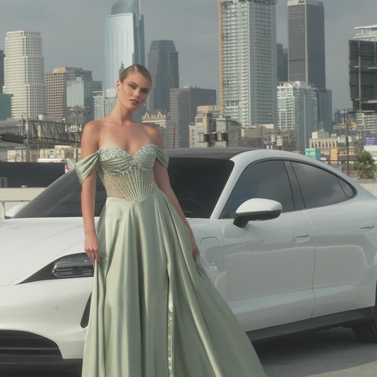 This elegant A-line gown is the epitome of refined beauty, featuring a strapless sweetheart neckline with removable off-the-shoulder straps for a customizable look. The intricately beaded bodice, adorned with delicate mini floral embellishments, flows seamlessly into a soft satin skirt with a graceful leg slit. The structured boned bodice and lace-up corset back ensure a flattering fit, making it a perfect choice for prom or any formal event.