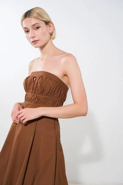 Make a subtle statement in the Mystic Midi Dress, a strapless style crafted from breathable cotton for warm-weather wear. Designed with a flattering shirred bodice and a center cutout that adds a modern edge, the A-line skirt creates a flowy, feminine silhouette.