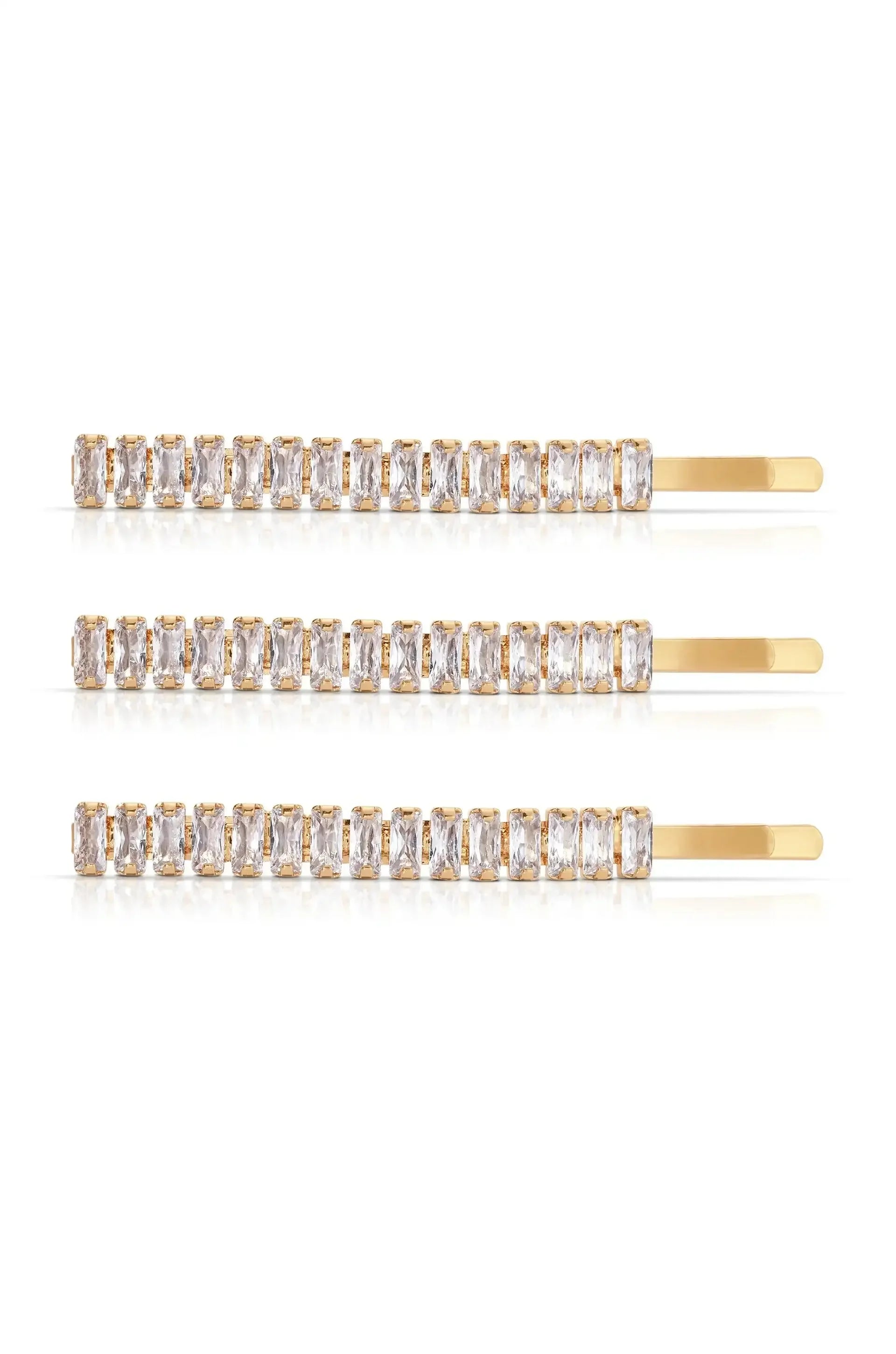 Three gold hairpins adorned with rectangular, clear gemstones are arranged horizontally against a white background, reflecting light and showcasing their elegant design.