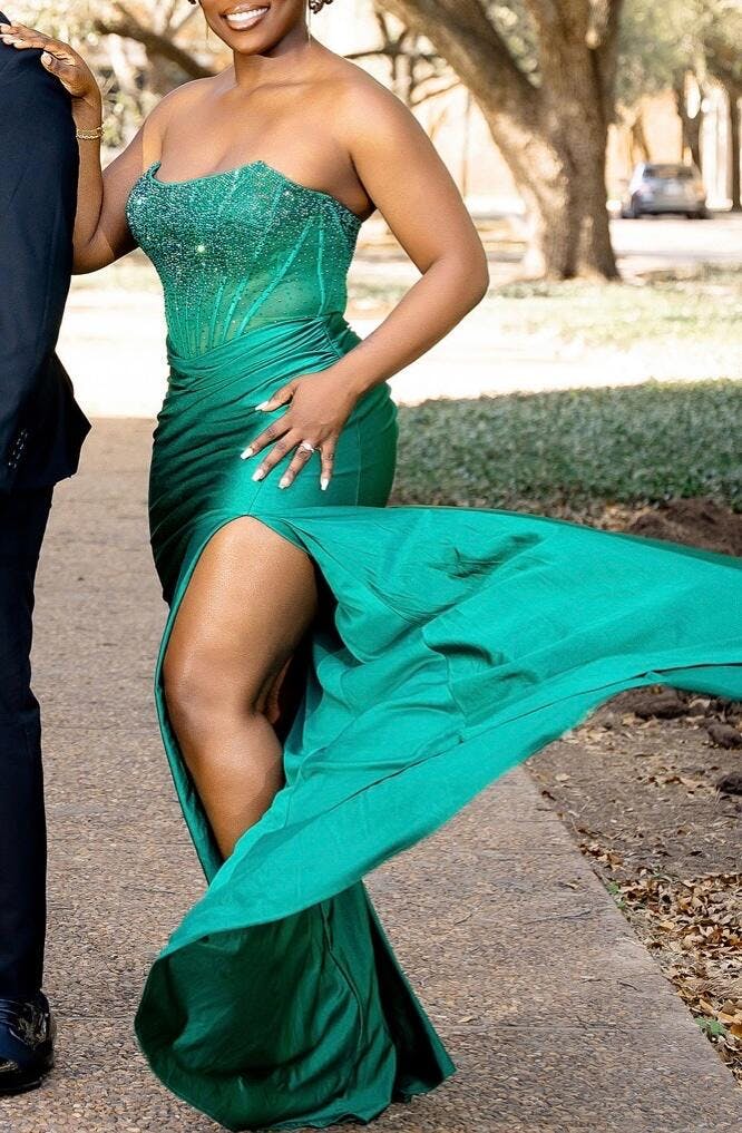 Get ready to make a statement in our Natalie Gown. This beautiful strapless gown features a hot stone corset that will highlight your figure and make you stand out in any crowd. The rich emerald color adds a touch of elegance to this already stunning piece. Perfect for any formal occasion.