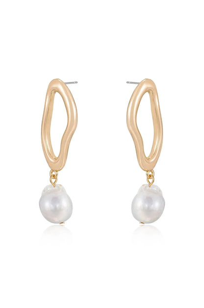 Gold hoop earrings feature an organic, wavy design with a dangling irregularly shaped white pearl. They are displayed against a simple, reflective background, emphasizing their elegance.