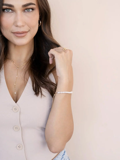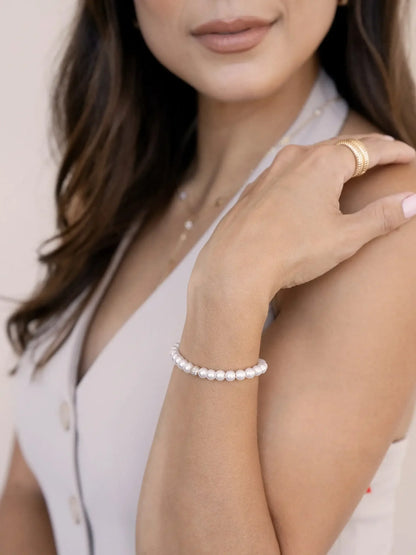A woman is gently resting her hand on her arm, showcasing a pearl bracelet. She is wearing a light-colored top, and her skin has a soft, natural glow.