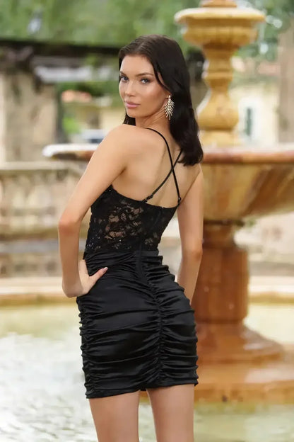Take your style up a notch with this ruched satin mini dress! You'll be sure to turn heads in this little number with its sweetheart neckline, pretty sequin lace corset detailing, and mini-length, curve-hugging silhouette. Pair with some heels and statement earrings for a gorgeous night out look.