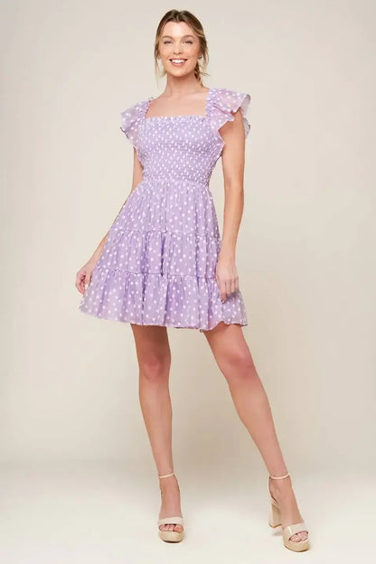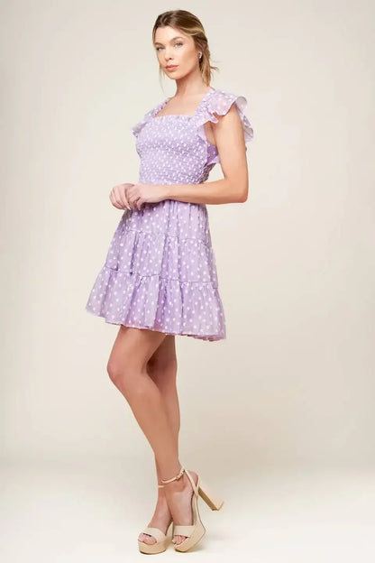 A textured lavender woven mini dress featuring square neckline, ruffled sleeve, smocked bodice and tiered skirt.