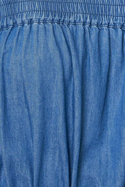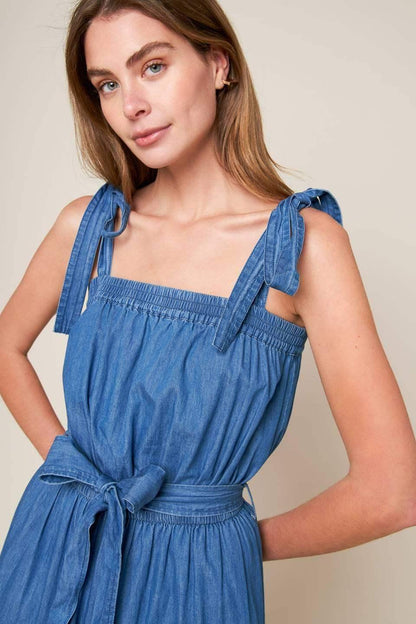 Revamp your vacation wardrobe with this chambray maxi dress! It boasts a straight neckline, shoulder ties, and an elasticized waist for a comfortable fit. The self sash tie and tiered skirt add a touch of elegance to this must-have piece.