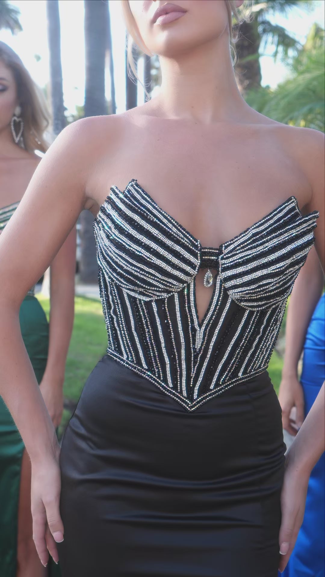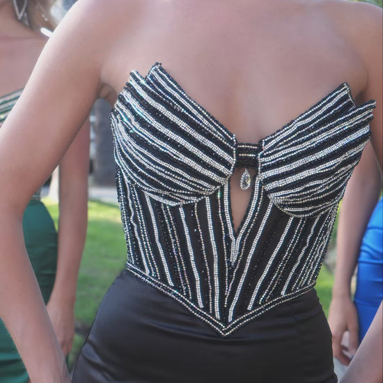 Experience elegance and luxury in the PS25187 Portia & Scarlett dress. This stunning gown showcases a beaded corset top with a bold cutout below the bust and a captivating gem embellishment. The strapless sweetheart neckline adds a touch of excitement, while the sleek, form-fitting silhouette flows into a refined skirt. A seductive thigh-high slit adds to the charm, and the graceful train at the back guarantees a memorable entrance. Ideal for prom or any formal occasion, this dress is a true statement piece that will leave a lasting impression.