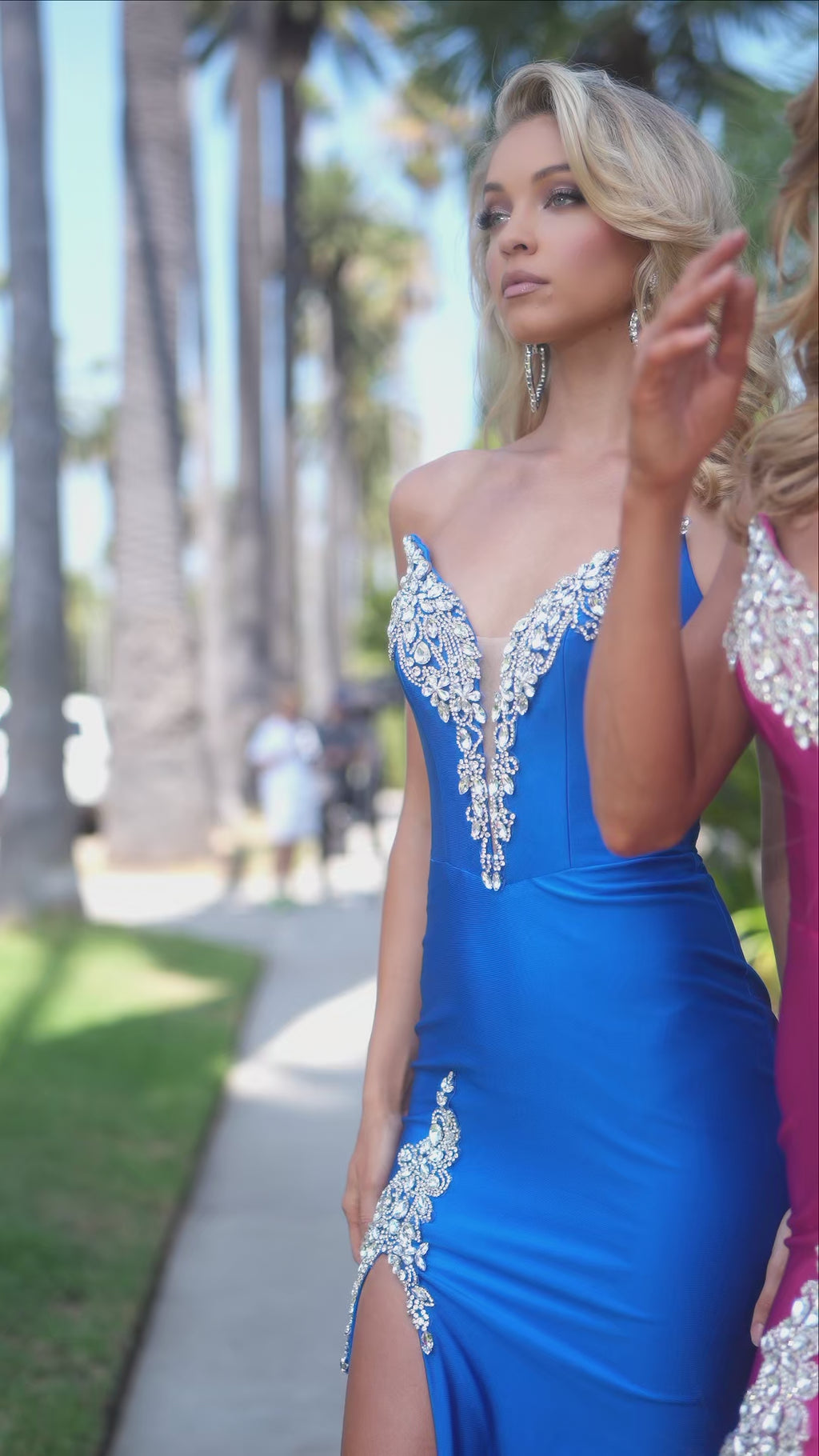 Exude radiance and glamour in the Portia & Scarlett PS25201 dress. This sophisticated, strapless column gown seamlessly combines elegance with allure. The V-neckline and figure-hugging silhouette highlight your curves, while intricate beadwork lends a touch of opulence. Featuring a bold thigh-high slit and dramatic train, this dress oozes sensuality, making it ideal for making a statement. Crafted from luxurious jersey fabric, the gown boasts a seamless zipper back for a flawless and flattering fit.