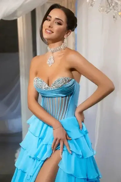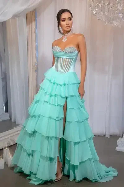 Expertly designed by Portia & Scarlett, PS25961 embodies elegance. The layered ruffle skirt exudes delicate charm, while the sheer bodice features intricate beading and crystals. Finished with a leg slit, this dress will make you the focal point at any formal occasion.