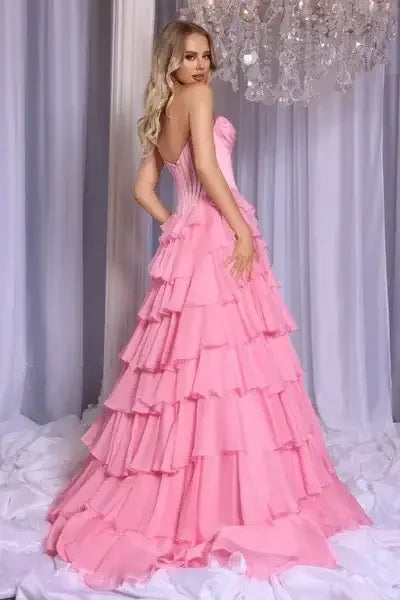 Masterfully crafted by Portia & Scarlett, PS25963 exudes elegance. The delicate charm of the layered ruffle skirt and the lace trim on the boned bodice make this dress a must-have for any formal event. With a leg slit that adds a hint of sass, all eyes will be on you in this exquisite piece.