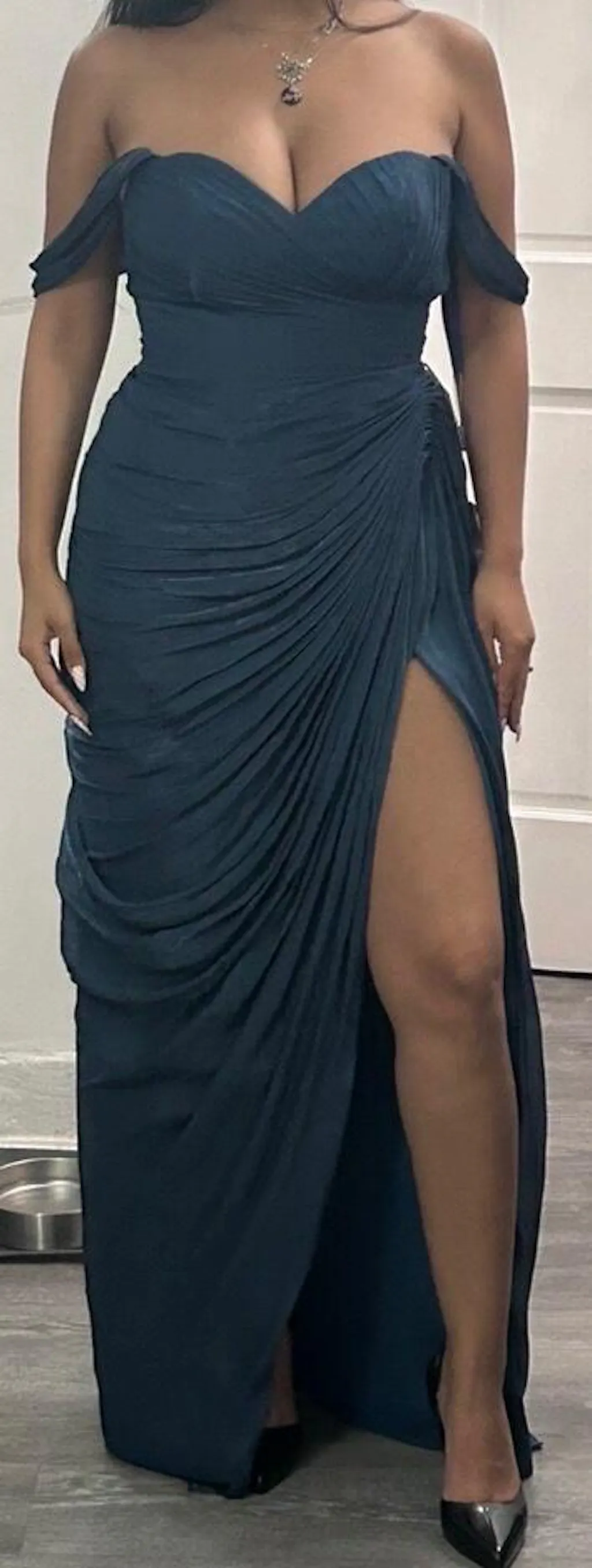 Timeless and ethereal, the Raisa Gown is crafted from pleated luminescent chiffon that softly catches the light with every step. Designed with a straight off-the-shoulder neckline, this gown features a sculpted bodice that flatters the figure while maintaining a romantic, refined aesthetic. Gentle draping throughout the skirt adds fluid movement and elegant dimension.