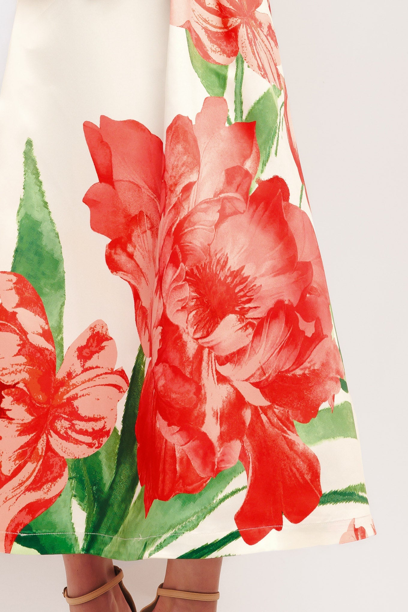 Twirl into romance with this ivory midi dress that's all about making a statement. A bold floral print dances across the fabric while a flattering V-neckline and sleeveless cut keep things breezy and elegant. The wide waistband cinches your silhouette beautifully, leading into a full, swishy skirt perfect for spinning on the dance floor. Secured with a back zipper, this dress is your go-to for occasions that call for a little extra charm and personality.