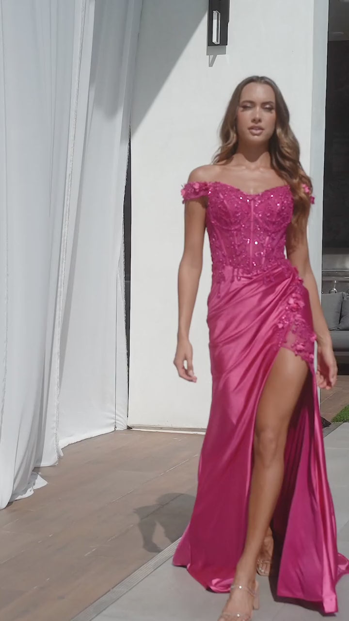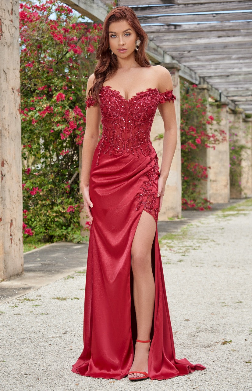 The Rosaline Gown is a gorgeous off-the-shoulder choice for your next event! It features a lace-adorned sheer bodice with floral appliqués, adding subtle elegance. The soft satin skirt is highlighted by a thigh-high leg slit, embellished with detailed flowers and beading. This gown is absolutely perfect for any special occasion, whether it's a black-tie event, prom or wedding.