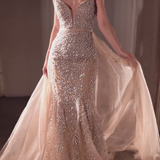 The removable overskirt, crafted from layered nude tulle with scattered embellishments, provides versatility, letting you switch between two breathtaking looks. Perfect for red carpet events, gala nights, or other formal occasions, this gown exudes elegance, luxury, and unforgettable style.