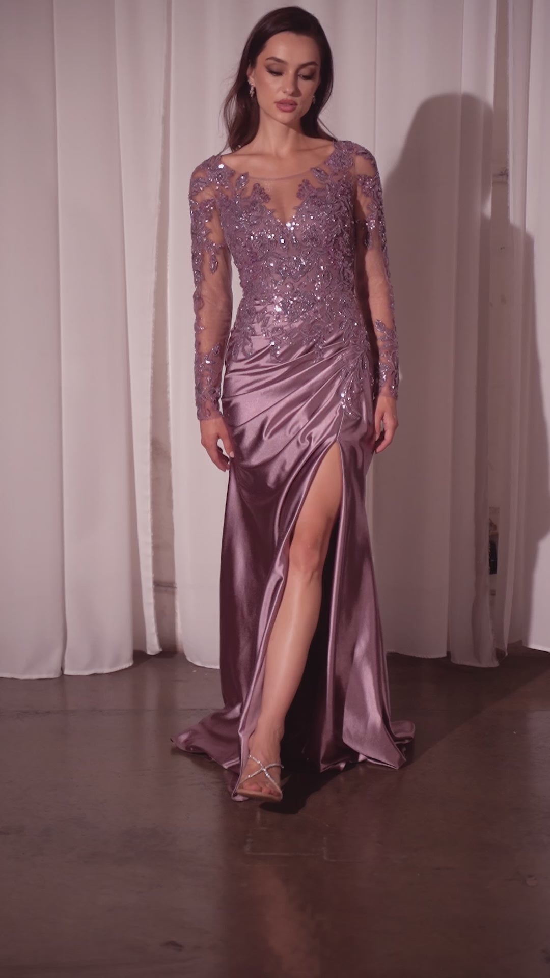 Embrace refined elegance in the Sandra Gown, a stunning fitted dress, designed for timeless sophistication. The long sleeves and deep V-neckline highlight the intricately embellished lace bodice, creating a luxurious and feminine touch. Crafted from semi-stretch satin, the skirt hugs your curves beautifully, featuring a tasteful leg slit and a pleated waistline for an effortlessly flattering silhouette. Perfect for formal events, black-tie weddings, or as a chic mother-of-the-bride ensemble, this gown ensures you'll look and feel your absolute best.