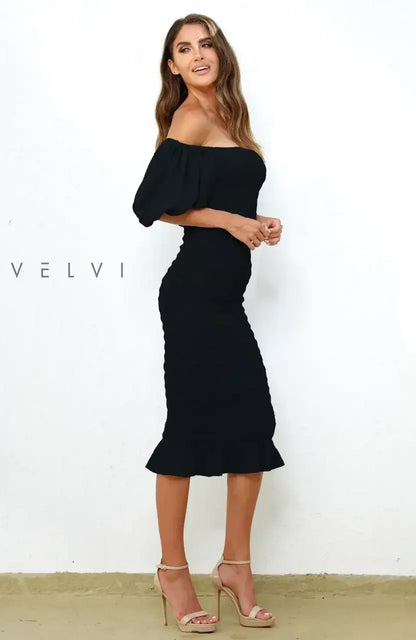 The Skyla Shirred Midi Dress in Black by Velvi is a simple and elegant style that you'll feel your best in! Adding a hint of drama with the puff lantern sleeve detail and a shirred body style makes it the perfect wear-all-day style.