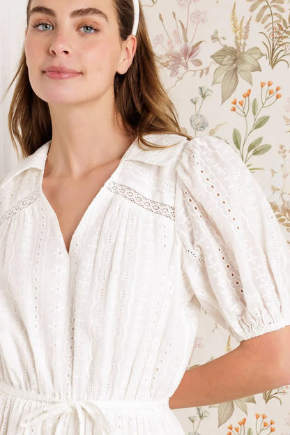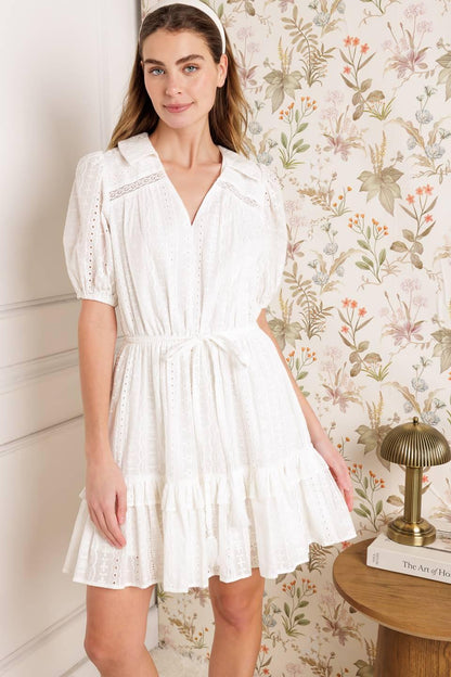 Meet Jovie — crisp, cute, and effortlessly polished. This white woven eyelet mini dress features a structured collar, button-down front, and sleeveless silhouette for a fresh, tailored vibe. The eyelet fabric adds a feminine twist, while the back zipper keeps the fit sleek and easy.