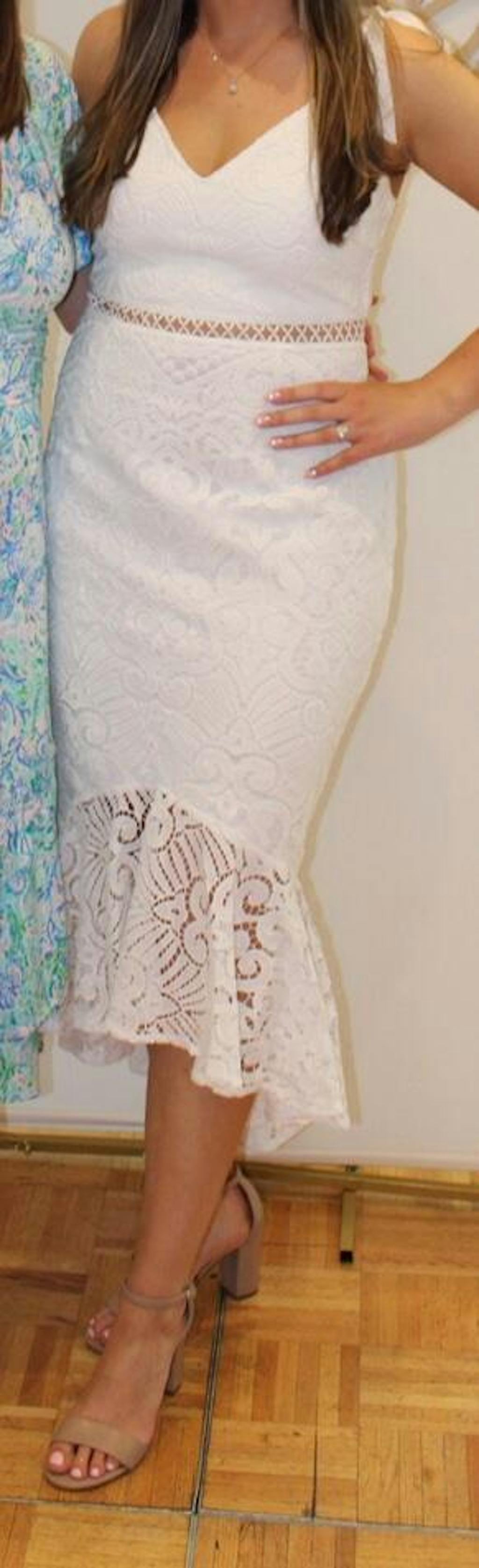 The Tahlia Dress in White is a stunning lace midi dress, perfect for any special occasion. Wear it for you graduation, bridal shower, bachelorette, rehearsal dinner or Engagement photos! It has a v neckline with gorgeous intricate lacework, adorned with a delicate pattern that creates a sense of ethereal beauty. The lace extends down to the mid-thigh and flows into a flirty fishtail hem creating a captivating silhouette. Delicate tie straps provide a dainty and airy feel, ensuring comfort throughout your event.