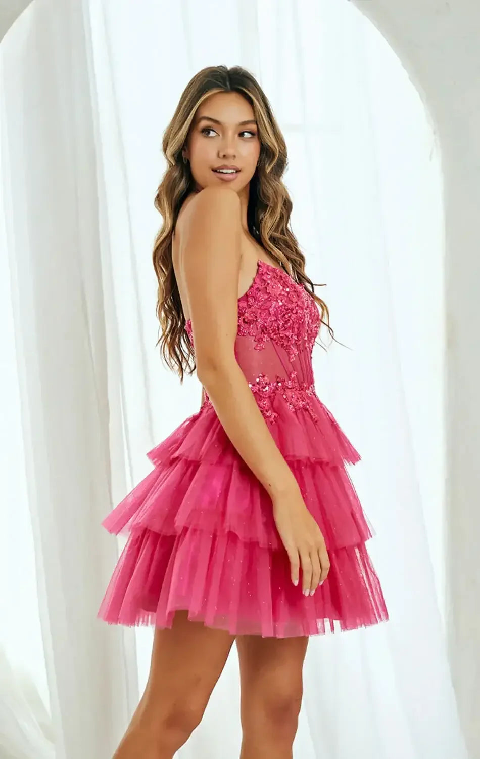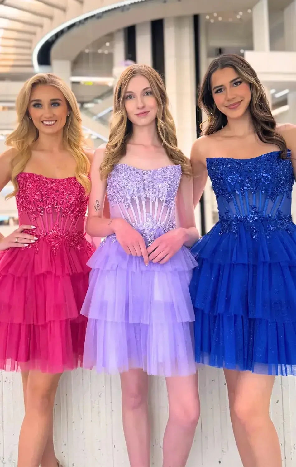 Add a touch of magic to your wardrobe with the Tansy Mini Dress, a fairy-inspired favorite for homecoming, cocktail parties, and special occasions. This dreamy mini showcases a strapless scoop neckline with floral lace embellishments that bring romantic detail to the sheer corset bodice. The open lace-up back ensures the perfect fit, while the layered glitter tulle skirt creates a whimsical sparkle with every step.