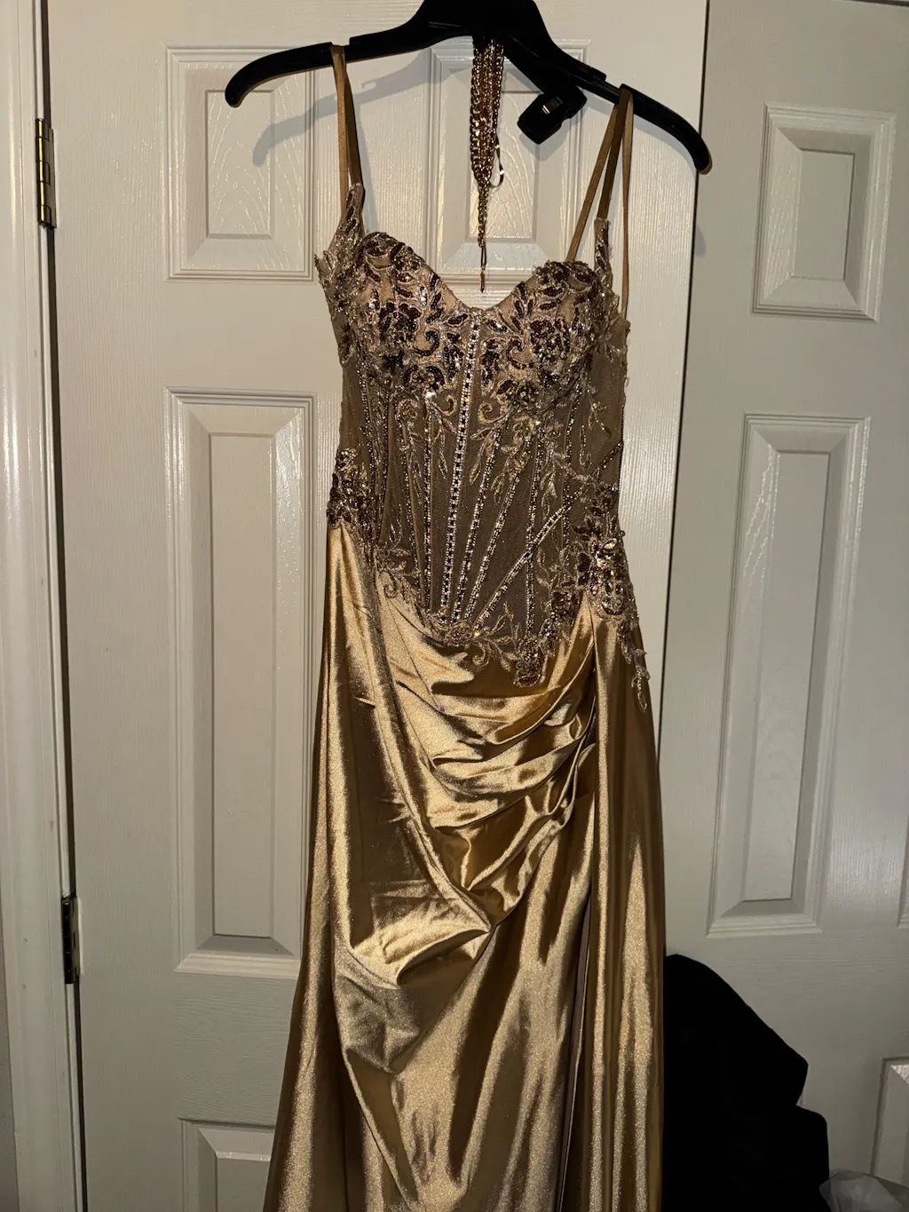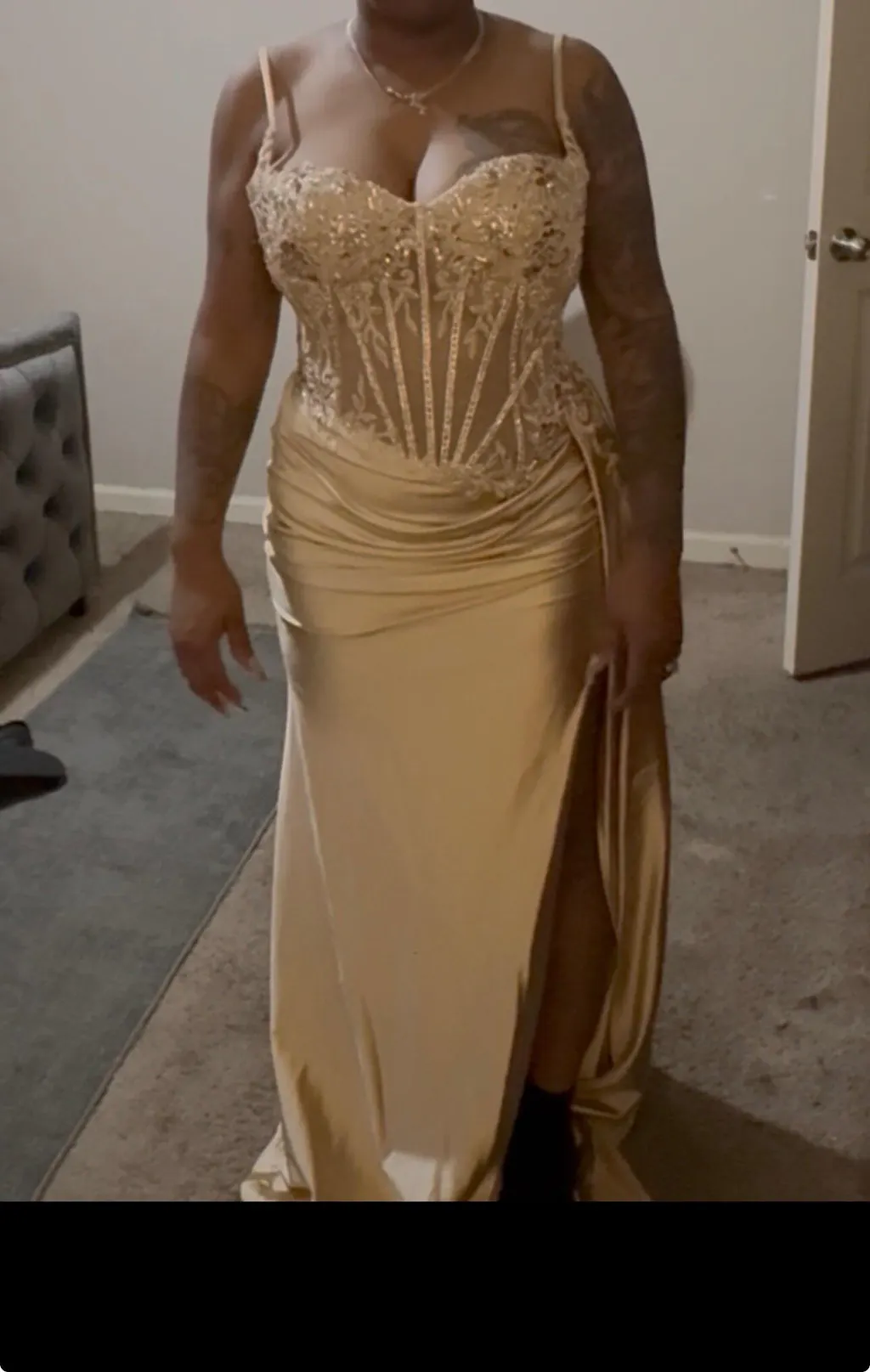 This embellished lace and satin dress is absolutely stunning! With its delicate lace detailing, ruched waistline, and satin fabric, the Teagan Gown exudes an air of effortless elegance. The fitted silhouette is designed to hug your curves, while the intricate lace bodice adds a sophisticated touch. The leg slit in the satin skirt not only adds a sexy vibe but also ensures you can move with ease. It’s the perfect combination of glamour and comfort. Whether you're attending a glamorous evening event or a chic night out, this dress is bound to make you the center of attention.