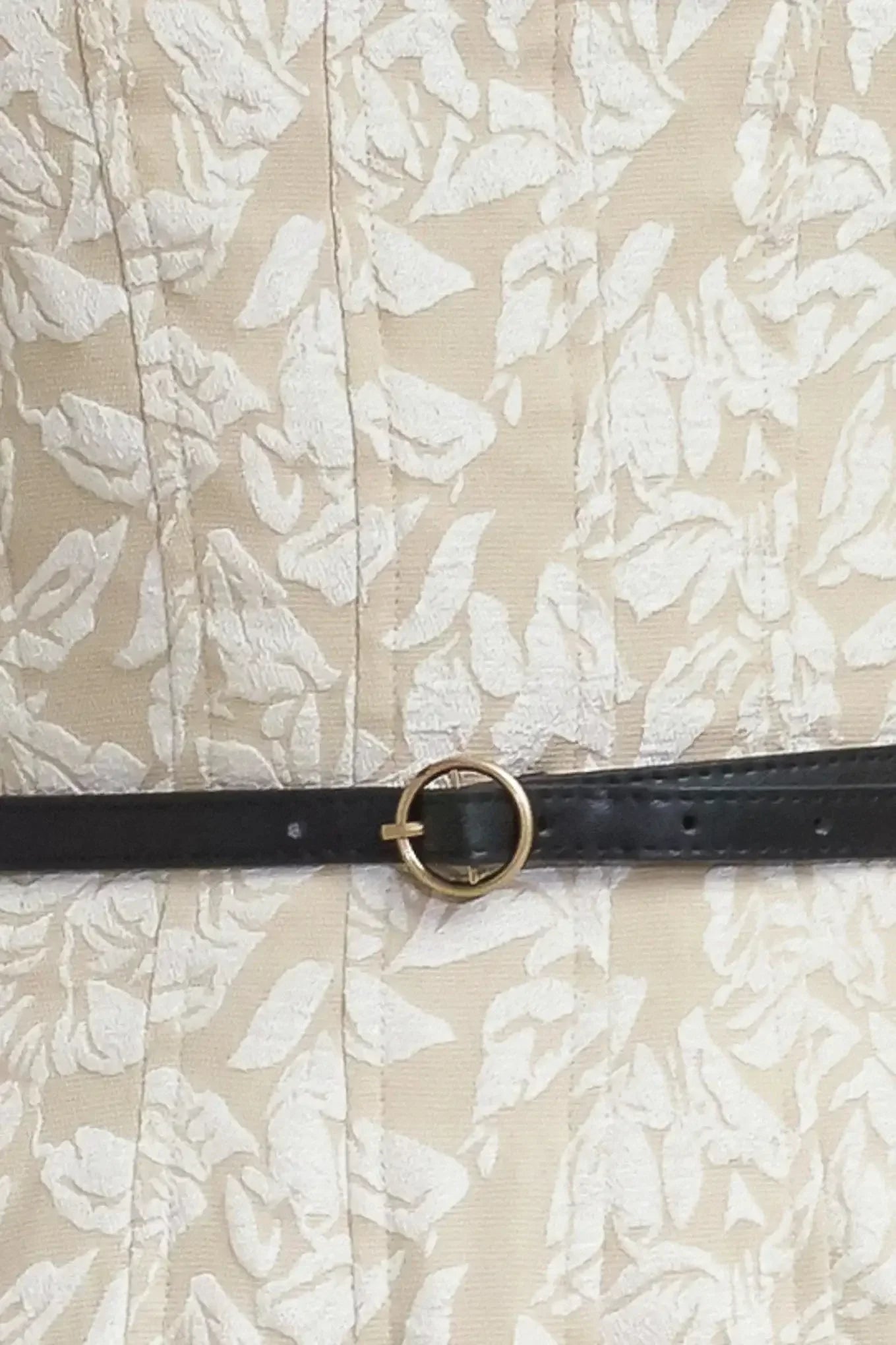 This midi dress is crafted from textured woven fabric and includes a strapless design, a contrasting belt, a pleated full skirt, and a zipper closure at the back.