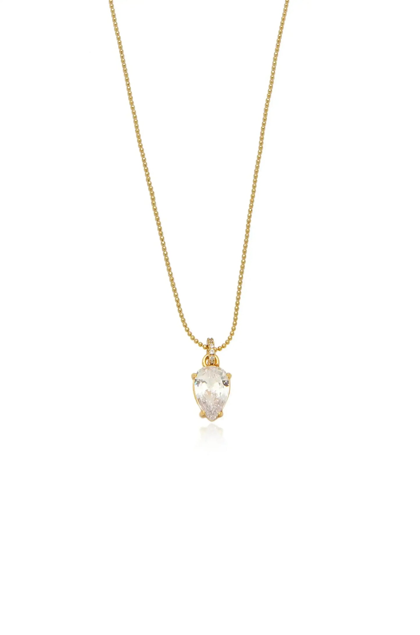 A gold necklace features a pear-shaped crystal pendant, elegantly suspended and catching light, creating a shimmering effect. The design is simple yet sophisticated, suitable for various occasions.