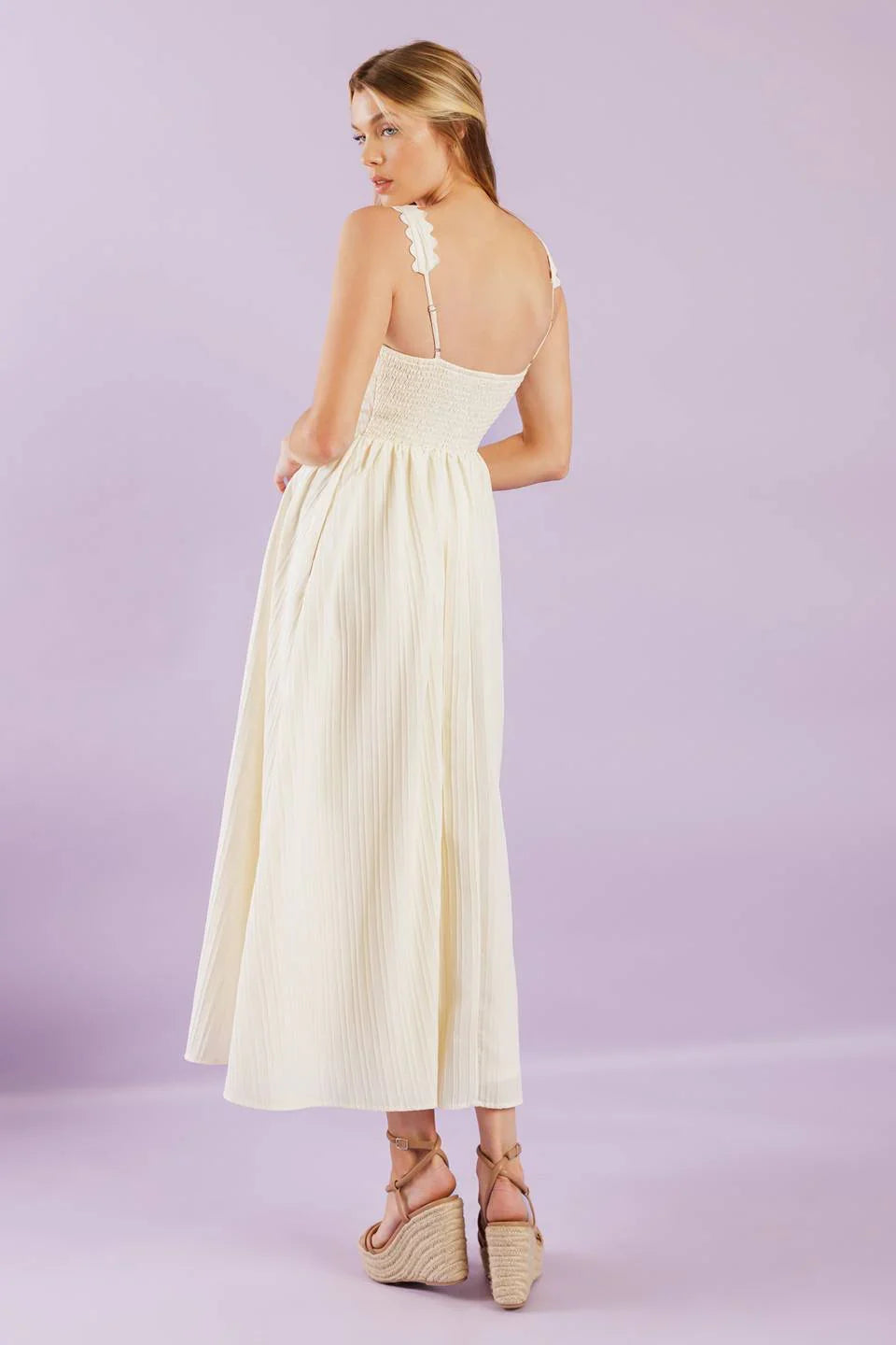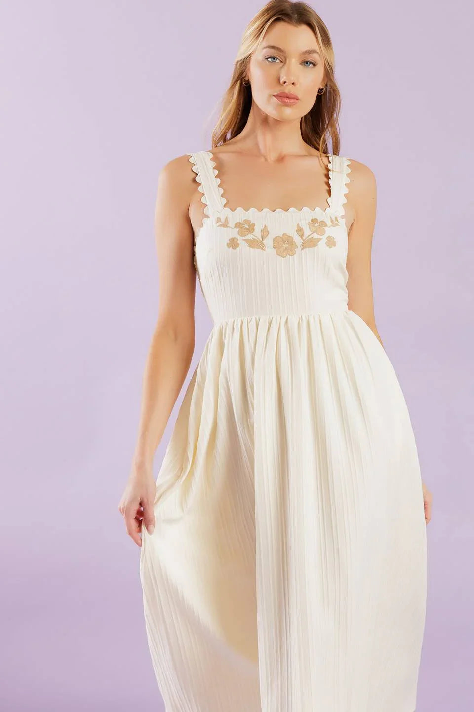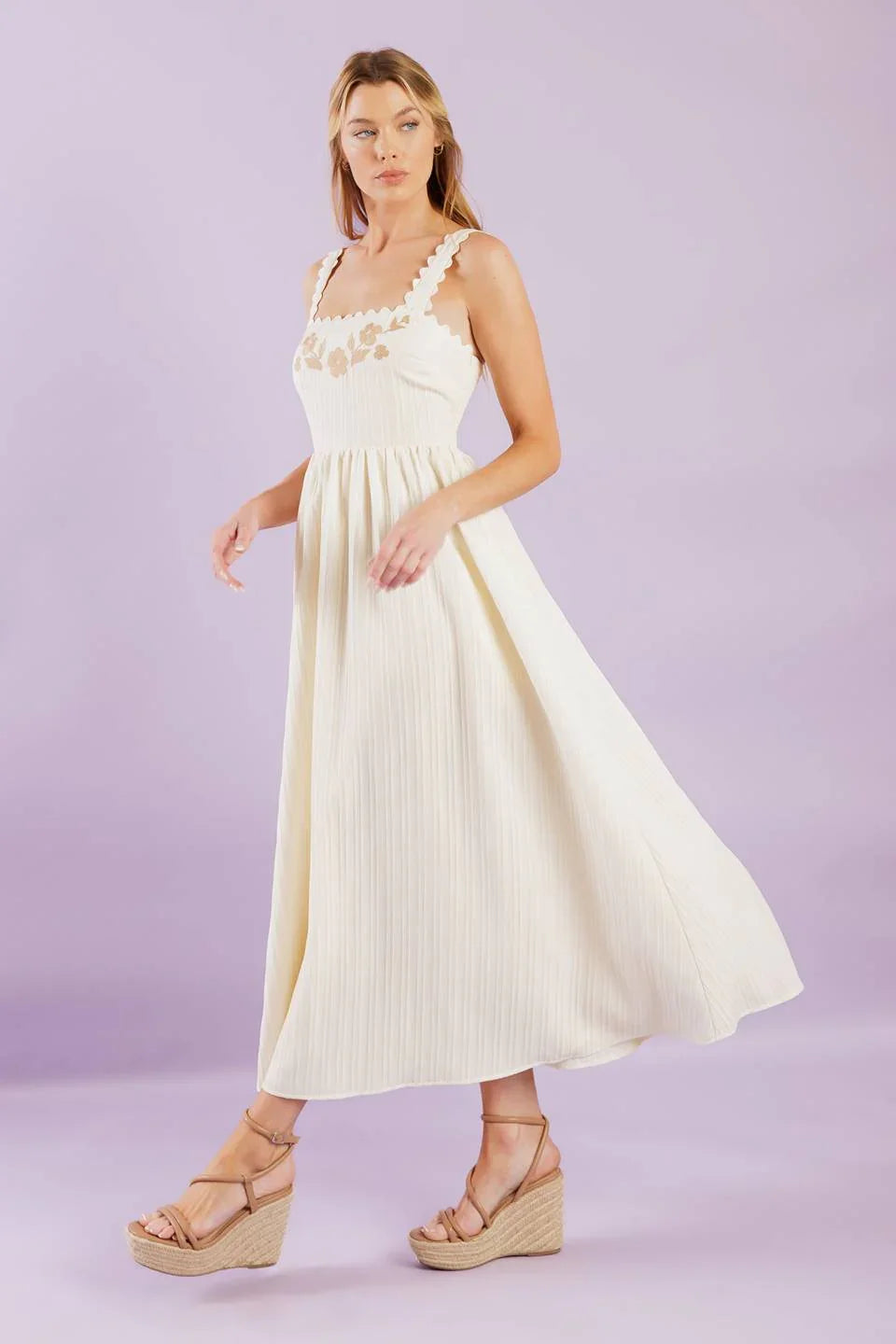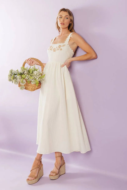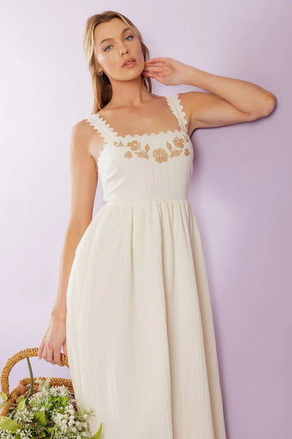 Discover effortless charm in the Brisk Adventures Embroidered Midi Dress, crafted from delicate woven fabric in a soft cream hue. This dress features an elegant squared neckline, romantic short puff sleeves, and a smocked bodice that provides a comfortable, flattering fit. A self-tie sash cinches the waist, leading to a graceful full skirt adorned with intricate embroidery for a touch of timeless detail.
