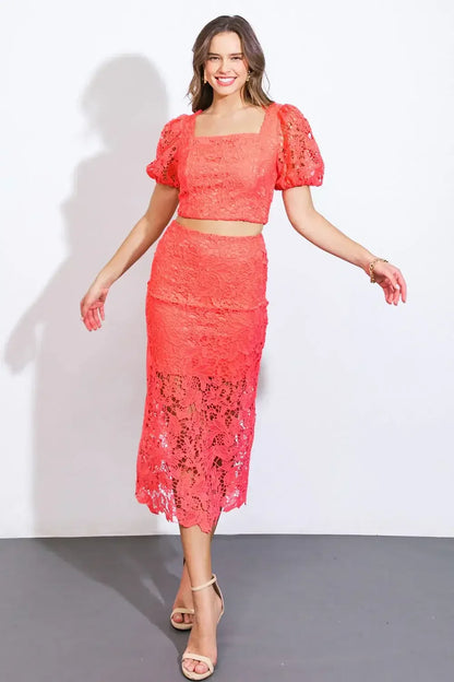 Romantic and refined, the Lace Reverie Set is designed to make a delicate statement. This two-piece woven lace set features a cropped top with a square neckline, short puff sleeves, and a hidden back zipper for a clean finish. The matching midi skirt completes the look with a flattering fit and back zip closure. Perfect for bridal showers, garden parties, or any occasion that calls for effortless elegance.