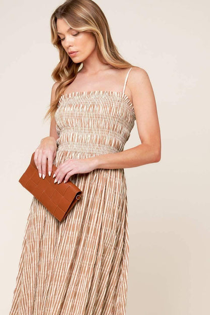 Step into timeless style with the Valhalla Brown Striped Midi Dress. Crafted from soft woven fabric, this midi dress features a flattering straight neckline adorned with a delicate ruffled edge, adjustable straps, and a flowing full skirt that moves with effortless grace. The subtle striped pattern adds a classic touch perfect for any occasion.