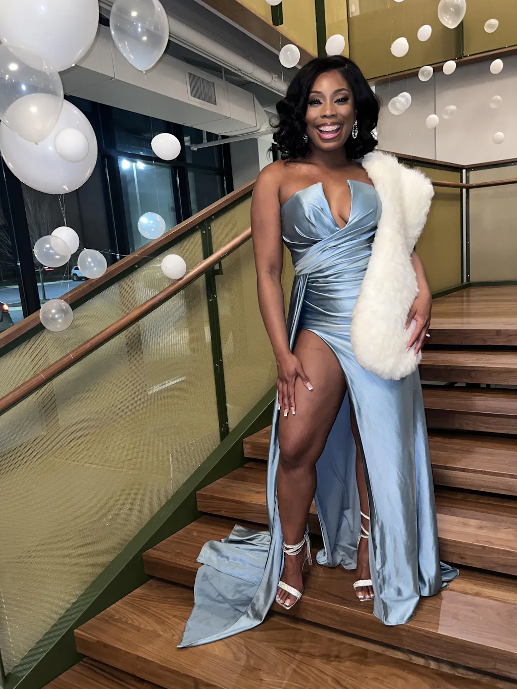 The Vaughn Gown is crafted to create a figure-flattering silhouette with its fit-and-flare design. It enhances your natural curves, highlighting your overall shape. The deep V-neckline adds a touch of sensuality while elongating the neckline and showcasing the collarbones—a classic and elegant detail in formal wear. The asymmetrical sash introduces a whimsical charm, and the seductive leg slit provides a daring touch, revealing just the right amount of leg. This gown combines flirtatious allure with sophistication, making it perfect for any special occasion where you want to make a memorable impression.