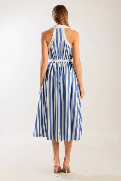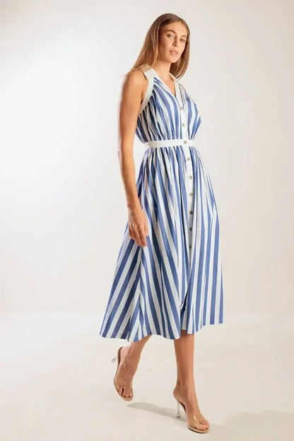 A navy and white striped woven midi dress featuring collar, V neckline, button down, and full skirt.
