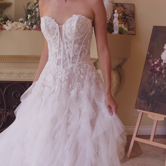 This elegant drop waist wedding gown features a strapless sweetheart neckline and a fitted drop waistline, creating a flattering silhouette. The A-line ruffle skirt, crafted from lace and layered tulle, adds a romantic touch with its cascading layers. Ideal for a bridal dress, this gown combines timeless sophistication with modern charm.